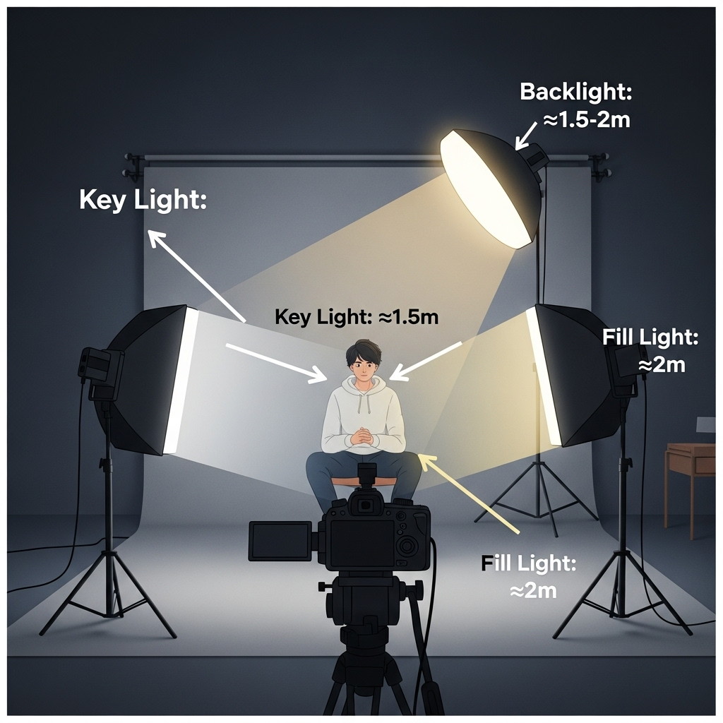 Esse esquema, conhecido como “três pontos de luz”, é referência em produções audiovisuais.